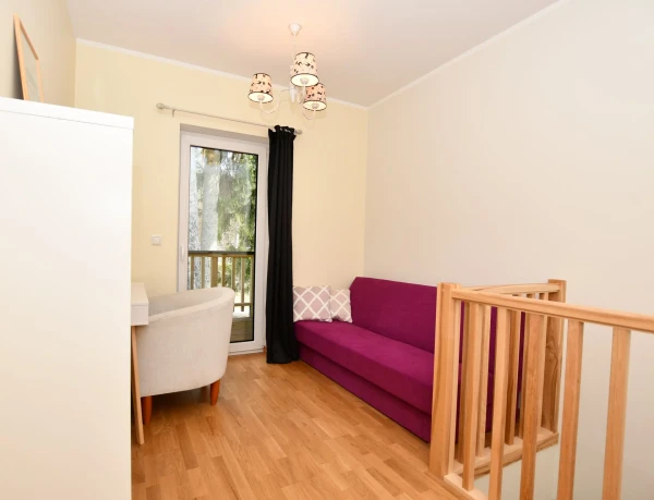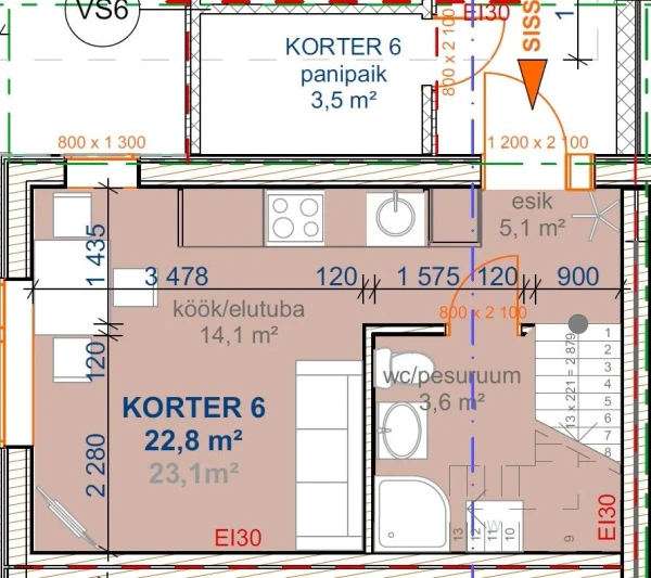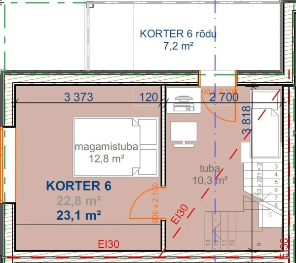 Korteri üldpind on 49,4 m2 (sisaldab panipaiga pindala 3,5 m2), köetav pind 45,9 m2, millele lisandub rõdu 7,2 m2 ning planeeringult on tegemist eraldi sissepääsuga läbi kahe korruse korteriga, mille koosseisu kuuluvad I korrusel esik, elutuba-köök ja duširuum-WC, II korrusel on trepihall/kontor, kust pääseb rõdule ning magamistuba.